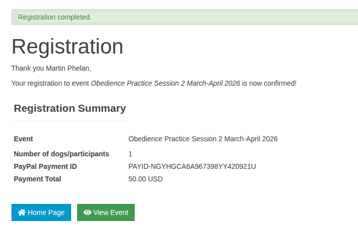 - Then continue as normal with the credit card payment. After you submit payment you will return to a screen like below: